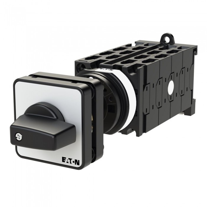 Przełącznik, Zacisk śrubowy: Łączniki sterownicze, odniesienie do grupy części: T0, z czarnym pokrętłem z tabliczką czołową, Styki: 16, Stopień ochrony: Przód IP65, Projekt: montaż na panelu tylnym, Kąt przełączania: 90°, Przebieg łączenia: bez samopowrotu, Bez pozycji 0 (wył.), tabliczka czołowa: 1-2, Moc znamionowa AC-23A, 50 - 60 Hz 400 V: P = 5,5 kW, Znamionowy prąd ciągły: Iu = 20 A, 8 zespoł montażowy, Normy: IEC/EN 60947, VDE 0660, IEC/EN 60204, CSA, UL, rozłącznik izolacyjny zgodnie z normą IEC/EN 60947-3