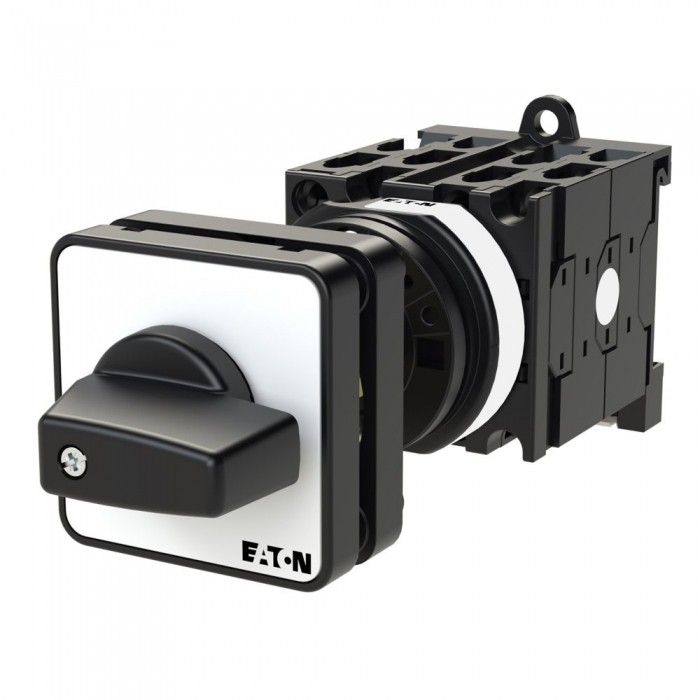 Przełącznik, Zacisk śrubowy: Łączniki sterownicze, odniesienie do grupy części: T0, z czarnym pokrętłem z tabliczką czołową, Styki: 8, Stopień ochrony: Przód IP65, Projekt: montaż na panelu tylnym, Kąt przełączania: 60°, Sposób przełączenia: bez samopowrotu, z pozycją 0 (wył.), tabliczka czołowa: 1-0-2, Moc znamionowa AC-23A, 50 - 60 Hz 400 V: P = 5,5 kW, Znamionowy prąd ciągły: Iu = 20 A, 4 segmenty stykowe, Normy: IEC/EN 60947, VDE 0660, IEC/EN 60204, CSA, UL, rozłącznik izolacyjny zgodnie z normą IEC/EN 60947-3