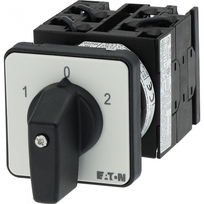 Przełącznik liczby biegunów, Zacisk śrubowy: Łączniki sterownicze, odniesienie do grupy części: T0, z czarnym pokrętłem z tabliczką czołową, Styki: 8, Stopień ochrony: Przód IP65, Projekt: montaż podtynkowy, funkcja przełączania: Jedno uzwojenie odczepowe, 2 prędkości, Kąt przełączania: 60°, Sposób przełączenia: bez samopowrotu, z pozycją 0 (wył.), tabliczka czołowa: 1-0-2, Moc znamionowa AC-23A, 50 - 60 Hz 400 V: P = 5,5 kW, Znamionowy prąd ciągły: Iu = 20 A, 4 segmenty stykowe, Normy: IEC/EN 60947, VDE 0660, IEC/EN 60204, CSA, UL, rozłącznik izolacyjny zgodnie z normą IEC/EN 60947-3
