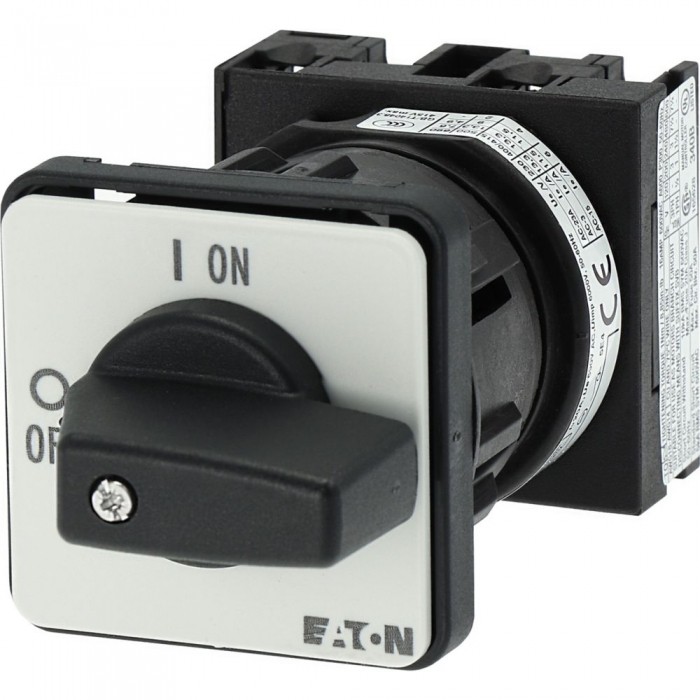 Przełącznik wł.-wył., Zacisk śrubowy: Przełącznik wł.-wył., Odniesienie grupy części T0, z czarnym pokrętłem z tabliczką czołową, 2-biegunowy, Stopień ochrony: Przód IP65, Projekt: mocowanie centralne, Kąt przełączania: 90°, Przebieg łączenia: bez samopowrotu, tabliczka czołowa: 0-1, Moc znamionowa AC-23A, 50 - 60 Hz 400 V: P = 5,5 kW, Znamionowy prąd ciągły: Iu = 20 A, 1 zespoł montażowy, Normy: IEC/EN 60947, VDE 0660, IEC/EN 60204, CSA, UL, rozłącznik izolacyjny zgodnie z normą IEC/EN 60947-3