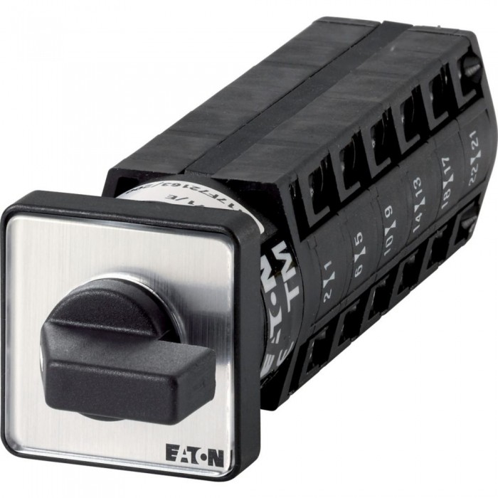 Przełącznik, Zacisk śrubowy: Łączniki sterownicze, odniesienie do grupy części: TM, z czarnym pokrętłem z tabliczką czołową, Zestyki: 12, Stopień ochrony: Przód IP65, Wykonanie: montaż podtynkowy, Kąt przełączania: 60°, Przebieg łączenia: bez samopowrotu, Bez pozycji 0 (wył.), tabliczka czołowa: 1-2, Moc znamionowa AC-23A, 50 - 60 Hz 400 V: P = 3 kW, Znamionowy prąd ciągły: Iu = 10 A, 6 zespoł montażowy, Normy: IEC/EN 60947, VDE 0660, CSA, UL, Przełącznik zgodny z IEC/EN 60947-5-1, Przełącznik pomocniczy zgodny z IEC/EN 60947-5-1