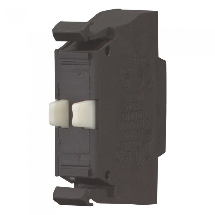 Element stykowy, Norma/Certyfikat: UL/CSA, IEC, Rozmiar: NZM1/2/3/4, Sposób podłączenia: Zacisk Cage Clamp, Mocowanie: Mocowanie z przodu, Opis: W przypadku korzystania z wyłączników awaryjnych M22-PV… maks. 2 styki = 4 styki rozwierne/zwierne, Cage Clamp jest zarejestrowanym znakiem handlowym firmy Wago Kontakttechnik GmbH/Minden, Niemcy, Styki Z = zwierne: 1 Z, Styki R = rozwierne: 1 R, Uwagi do styków: = funkcja bezpieczeństwa, przez wymuszone otwarcie zgodnie z IEC/EN 60947-5-1, Skok elementu uruchamiającego i siła załączania zgodnie z DIN EN 60947-5-1, K.5.4.1: mm 4,8, Maksymalny skok: mm 5,7, Minimalna siła do wymuszonego otwarcia: N 20