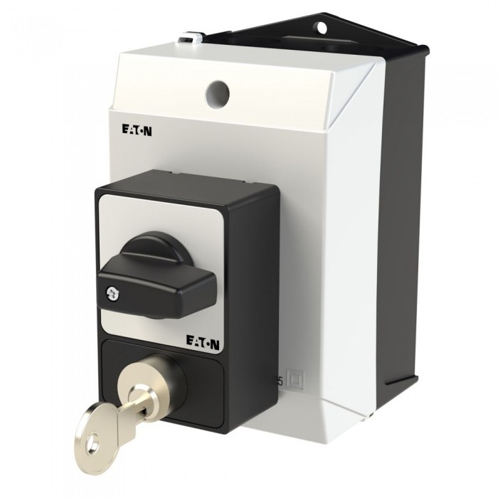 Przełącznik wł.-wył., Zacisk śrubowy: Przełącznik z mechanizmem blokującym, Odniesienie grupy części T0, z czarnym pokrętłem z tabliczką czołową, Informacje dotyczące dostarczonego sprzętu: z dwoma kluczykami, 3-biegunowy, mechanizm blokujący: Zamek cylindryczny SVA, Uwagi: Kluczyk wyjmowany tylko w położeniu 0 (poz. A), Element blokujący: Możliwość zablokowania w położeniu 0 (Wył.), stopień ochrony: IP65, Projekt: montaż powierzchniowy, Kąt przełączania: 90°, Przebieg łączenia: bez samopowrotu, tabliczka czołowa: 0-1, Moc znamionowa AC-23A, 50 - 60 Hz 400 V: P = 5,5 kW, Znamionowy prąd ciągły: Iu = 20 A, 2 zespoł montażowy, Normy: IEC/EN 60947, VDE 0660, IEC/EN 60204