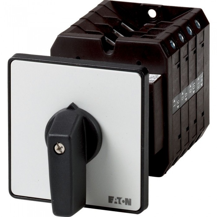 Przełącznik wł.-wył., Zacisk śrubowy: Przełącznik wł.-wył., Odniesienie grupy części T5B, z czarnym pokrętłem z tabliczką czołową, 6-biegunowy, Stopień ochrony: Przód IP65, Projekt: montaż na panelu tylnym, Kąt przełączania: 90°, Przebieg łączenia: bez samopowrotu, tabliczka czołowa: 0-1, Moc znamionowa AC-23A, 50 - 60 Hz 400 V: P = 30 kW, Znamionowy prąd ciągły: Iu = 63 A, 4 segmenty stykowe, Normy: IEC/EN 60947, VDE 0660, IEC/EN 60204, CSA, UL, rozłącznik izolacyjny zgodnie z normą IEC/EN 60947-3