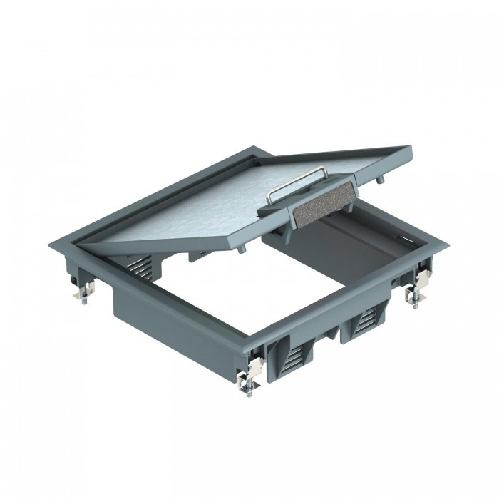 Kaseta zasilająca do montażu kanałowego 217x217x61 Poliamid stalowo-szary RAL 7011 Kaseta zasilająca uchwytem do podnoszenia pokrywy, na 6 x Modul 45 w 2 uniwersalnych puszkach instalacyjnych UT3, do zastosowania w systemach kanałów i w podłogach systemowych.