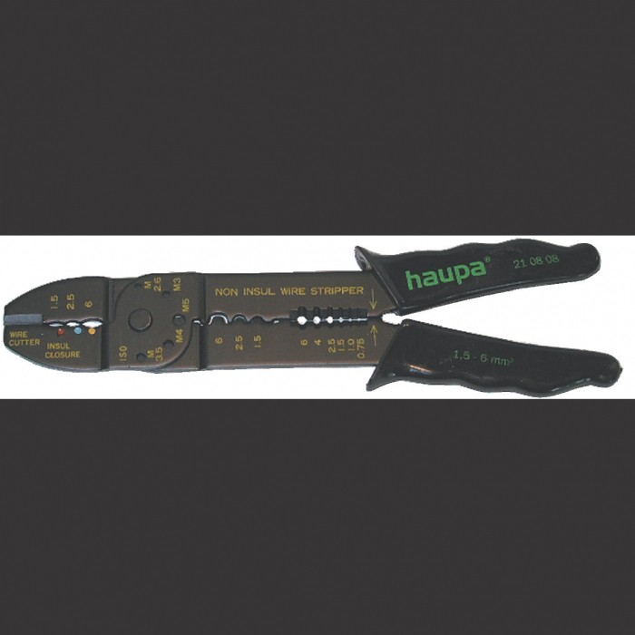 Kombi - praska do zaciskania do izolowanych i nieizolowanych końcówek kablowych i łączników od 1,5 - 6 mm2, ze stali C 45, szczypce dodatkowo hartowane indukcyjnie, z obcinakiem śrub z gwintem od M 2,6 do M 5, kabli i drutów oraz elementem do zdejmowania izolacji od 0,75 - 6 mm2, zacisk owalny