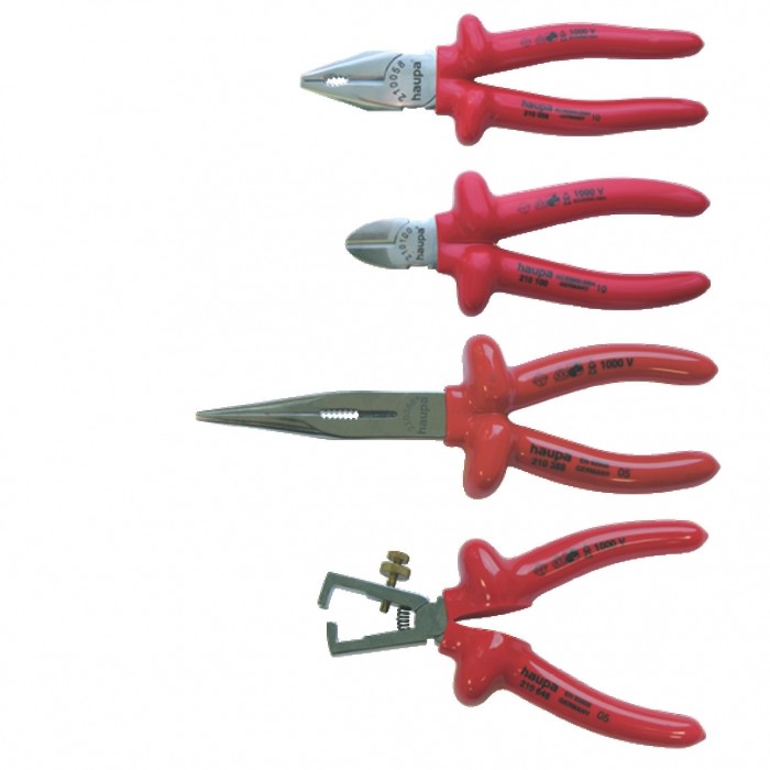 Zestaw szczypiec VDE, izolacja zanurzeniowa ze stali C 45, hartowane olejowo, szczypce chromowane na wysoki połysk, izolacja 2-kolorowa przez zanurzenie – na zewnątrz czerwona/wewnątrz żółta, 4-elem. Zawartość: szczypce kombinowane 180 mm szczypce do cięcia drutu 160 mm szczypce półokrągłe 200 mm szczypce do zdejmowania izolacji 160 mm