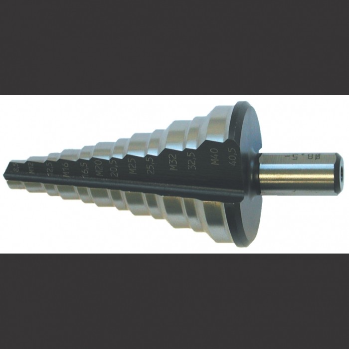 Wierto stopniowe z HSS do metrycznych otworów przelotowych i otworów pod gwint, 6 średnic otworów pod gwint o długości stopni 5 mm do blach do grubości max. 6 mm, długość stopnia 3 mm przy 6 średnicach otworów przelotowych do grubości materiału do max. 6 mm. Gradacja otworów przelotowych: 8,5 – 12,5 – 16,5 – 20,5 – 25,5 – 32,5 – 40,5 mm Gradacja otworów pod gwint: 10,5 (M12) – 14,5 (M16) – 18,5 (M20) – 23,5 (M25) – 30,5 (M32) – 38,5 mm (M40)