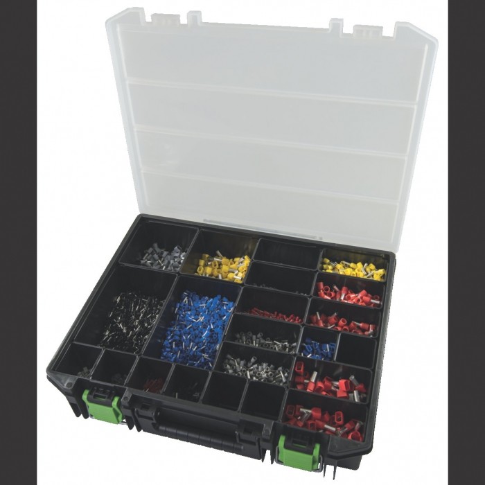 Zawartość: 4.700 końcówek tulejkowych izolowanych, seria DIN, w skrzynce asortymentowej z tworzywa 415 x 335 x 90 mm. 100 Końcówki tulejkowe Twin 8/0,5, białe, art. nr. 270778 100 Końcówki tulejkowe Twin 8/0,75, szare, art. nr. 270780 100 Końcówki tulejkowe Twin 8/1, czerwone, art. nr. 270784 100 Końcówki tulejkowe Twin 8/1,5, czarne, art. nr. 270788 100 Końcówki tulejkowe Twin 10/2,5, niebieskie, art. nr. 270792 100 Końcówki tulejkowe Twin 12/4, szare, art. nr. 270796 100 Końcówki tulejkowe Twin 14/6, żółte, art. nr. 270797 100 Końcówki tulejkowe Twin 14/10, czerwone, art. nr. 270798 500 Końcówki tulejkowe izolowane 8/0,5 białe, art. nr. 270801 500 Końcówki tulejkowe izolowane 8/0,75, szare, art. nr. 270802 500 Końcówki tulejkowe izolowane 8/1, czerwone, art. nr. 270805 1000 Końcówki tulejkowe izolowane 8/1,5, czarne, art. nr. 270807 500 Końcówki tulejkowe izolowane 8/2,5, niebieskie, art. nr. 270811 500 Końcówki tulejkowe izolowane 10/4, szare, art. nr. 270815 200 Końcówki tulejkowe izolowane 10/6, żółte, art. nr. 270818 200 Końcówki tulejkowe izolowane 12/10, czerwone, art. nr. 270822