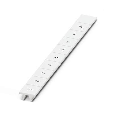 Oznacznik do zacisków, pasek, biały, opisany, zadrukowane wzdłuż: kolejne numery 1 ...9, rodzaj montażu: mocowanie zatrzaskowe, do styków o szerokości: 10,2 mm, wielkość pola opisowego: 10,15 x 10,5 mm, Ilość pojedynczych tabliczek: 9
