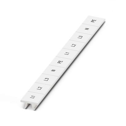 Oznacznik do zacisków, pasek, biały, opisany, opisywany przy pomocy: CMS-P1-PLOTTER, wzdłuż: L1, L2, L3, N, PE, L1, L2, L3, N, PE, rodzaj montażu: mocowanie zatrzaskowe, do styków o szerokości: 10,2 mm, wielkość pola opisowego: 10,15 x 10,5 mm, Ilość pojedynczych tabliczek: 10
