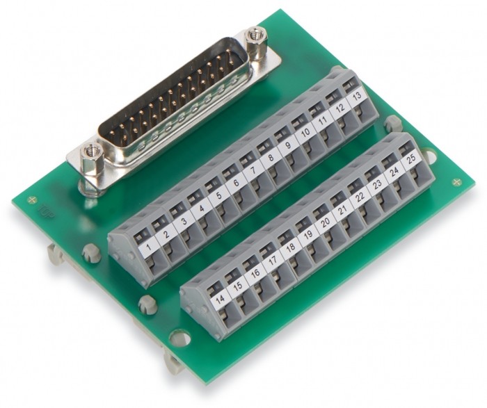 Moduł przejściowy; sub-min-d; wtyk; 25-bieg.; wielowtyk przeciwstawny z przyłączem do lutowania; podejście przewodem pionowe; złączki i złącza do pcb, 2-rzędowe; ze stopkami montażowymi; 2,50 mm2