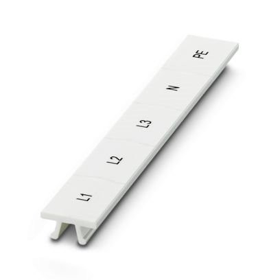 Pasek oznaczników typu zack, pasek, biały, opisany, zadrukowane wzdłuż: L1, L2, L3, N, PE, rodzaj montażu: mocowanie zatrzaskowe, do styków o szerokości: 15,2 mm, wielkość pola opisowego: 10,5 × 15,1 mm, Ilość pojedynczych tabliczek: 5