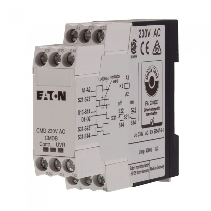 Przekaźnik nadzorujący stycznika, 220-240VAC Urządzenie monitorujące stycznik do zastosowań bezpiecznego zatrzymania awaryjnego, do poziomu wydajności e. Monitoruje niezawodne przełączanie stycznika zasilania. Zmniejsza ilość prac związanych z okablowaniem zasilania głównego, bez konieczności stosowania nadmiarowych styczników