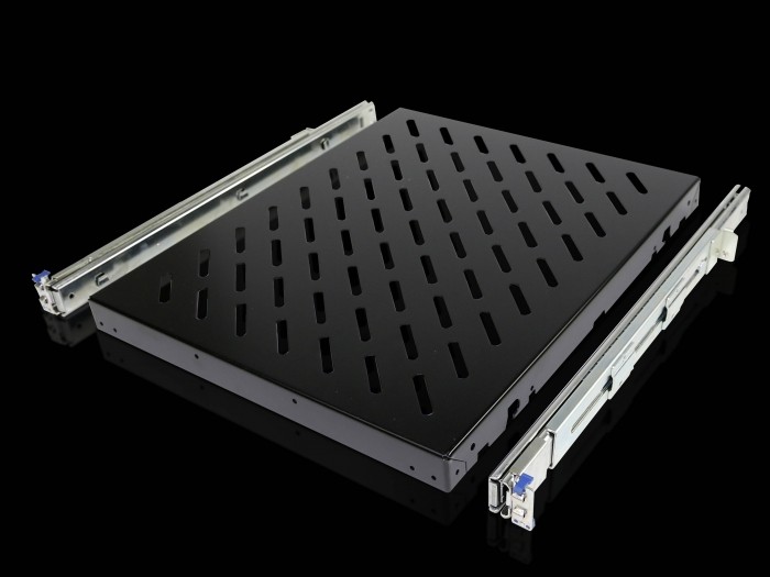 482,6 mm (19") – półka komponentowa, wysuwana półka o szerokości 482,6 mm, z teleskopowym zamkiem, przeznaczona do kątów montażu w kształcie litery L i podobnych kątów montażowych. Do montażu pomiędzy dwoma kątami montażowymi 482,6 mm (19"). Kompletny zestaw, w tym zestaw montażowy o zmiennej głębokości dla poziomów montażu 482,6 mm (19") od 400 do 600 mm. Montaż bez narzędzi, akcesoriów i oszczędzający czas, samodzielny montaż z przodu obudowy. Zlokalizować, wycofać się, szybko ustawić się. Perforowana powierzchnia półki komponentów, aby wspierać klimatyzację wewnątrz obudowy. Półka na komponenty jest samoblokowana, w pełni wysuwana. Głębokość półki komponentów 500 mm, ładowność 50 kg, wysokość półki komponentów 1