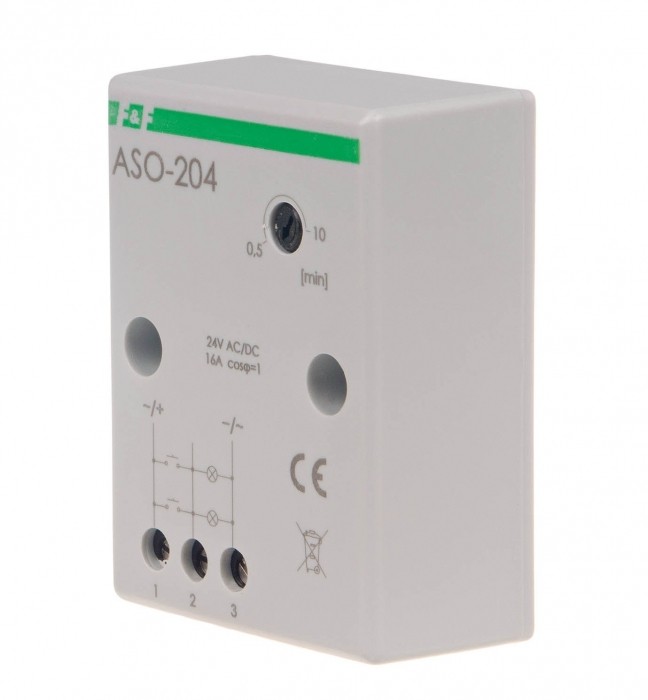 Zasilanie 24 V. Maksymalne obciążenie 16 A. Przyłącze: zaciski śrubowe. Współpracuje z przyciskami podświetlanymi. Automat schodowy służy do utrzymania włączonego oświetlenia korytarzy, klatek schodowych lub innych obiektów przez określony czas, po upływie którego oświetlenie zostanie wyłączone automatycznie.