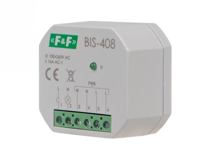 Zasilanie 230 V. Maksymalne obciążenie 16 A. Przyłącze: zaciski śrubowe. Współpracuje z przyciskami podświetlanymi. Elektroniczny przekaźnik bistabilny umożliwia załączenie oświetlenia lub innego urządzenia z kilku różnych punktów za pomocą równolegle połączonych przycisków sterujących. Przekaźnik BIS-408 występuje w wersji BIS-408i przystosowanej do załączania odbiorników o dużym prądzie udarowym, takich jak: lampy LED, świetlówki ESL, transformatory elektroniczne, lampy wyładowcze itp.