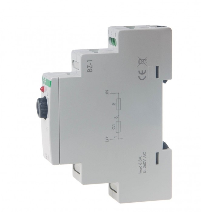 Napięcie zasilania 250 V AC Maksymalny prąd obciążenia 6,3 A Bezpiecznik wkładka topikowa O5×20 mm Przyłącze zaciski śrubowe 2,5 mm2 Moment dokręcający 0,4 Nm Temperatura pracy -25 ÷ 50 °C Wymiary 1 moduł (18 mm) Montaż na szynie 35 mm Stopień ochrony IP20