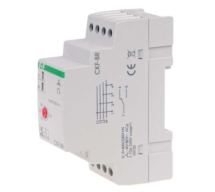 Z regulowanym progiem asymetrii napięciowej zadziałania. Styk 1 x NO/NC. Czujnik kolejności i zaniku faz przeznaczony jest do zabezpieczania silników elektrycznych zasilanych z sieci trójfazowej w przypadkach zaniku napięcia w co najmniej jednej fazie lub asymetrii napięć między fazami, grożących zniszczeniem silnika oraz zabezpieczeniem kierunku obrotów silnika w przypadku zmiany faz przed czujnikiem.