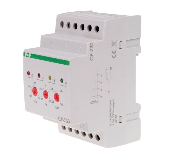 Trójfazowy. Z blokadą czasową. Przekaźnik napięciowy CP-730 służy do kontroli napięcia sieci trójfazowej i zabezpieczenia odbiornika jednofazowego przed skutkami wzrostu lub spadku napięcia poza ustawione wartości.