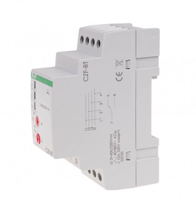 Z regulowanym czasem zadziałania. Styk 1×NO/NC. Czujnik zaniku fazy przeznaczony jest do zabezpieczenia silnika elektrycznego zasilanego z sieci trójfazowej w przypadkach zaniku napięcia, w co najmniej jednej fazie lub asymetrii napięć między fazami, grożącymi zniszczeniem silnika.