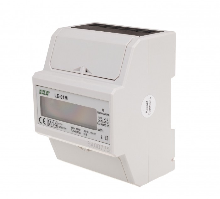 Zdalny odczyt. Jednofazowy. Port RS-485 + Modbus RTU. Zgodny z dyrektywą MID. LE-01M jest statycznym (elektronicznym) wzorcowanym miernikiem energii elektrycznej prądu przemiennego jednofazowego w układzie bezpośrednim. Służy do wskazań i rejestracji pobranej energii elektrycznej z możliwością zdalnego odczytu wskazań poprzez przewodową sieć standardu RS-485.