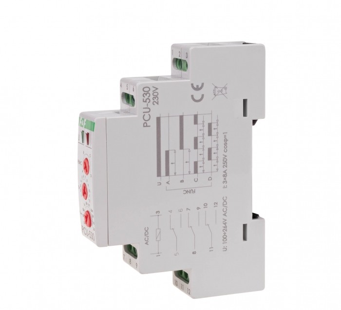 Napięcie zasilania 100÷264 V AC/DC Tryb pracy opóźnione wyłączenie, opóźnione załączenie, praca cykliczna Element wykonawczy przekaźnik Maksymalny prąd obciążenia 3 × 8 A Konfiguracja styków 3 × NO/NC Separacja styku TAK Opóźnienie zadziałania 50 ms Sygnalizacja stanu styku LED czerwona Czas działania - regulowany 0,1 s ÷ 576 godz. Sygnalizacja zasilania LED zielona Przyłącze zaciski śrubowe 2,5 mm2 Moment dokręcający 0,4 Nm Pobór mocy 0,15 W Temperatura pracy -25 ÷ 50 °C Wymiary 1 moduł (18 mm) Montaż na szynie 35 mm Stopień ochrony IP20