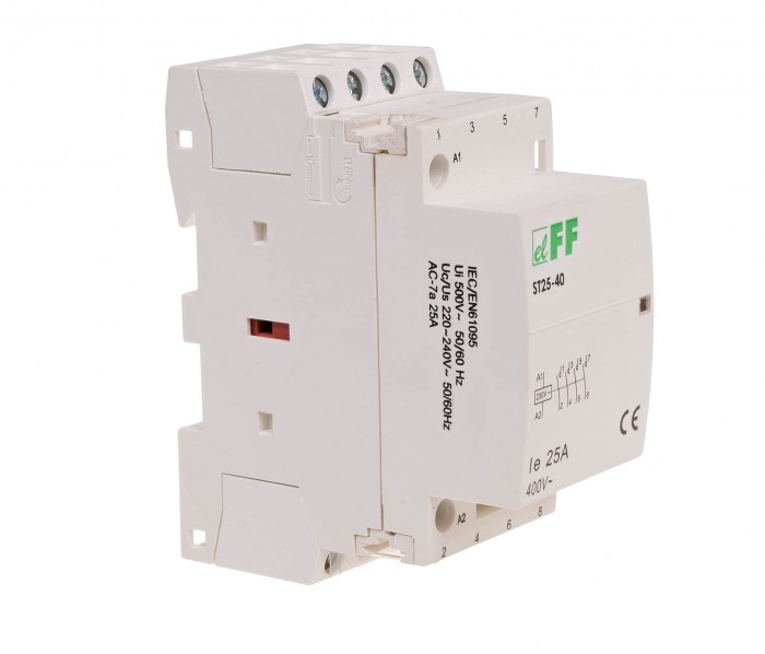 Stycznik modułowy. Prąd 25 A. Napięcie 230 V AC. Moc łączeniowa AC1 9 kW. Moc łączeniowa AC3 2,2 kW. Stycznik elektromagnetyczny w obudowie modułowej do bezpośredniego montażu na szynie 35 mm.