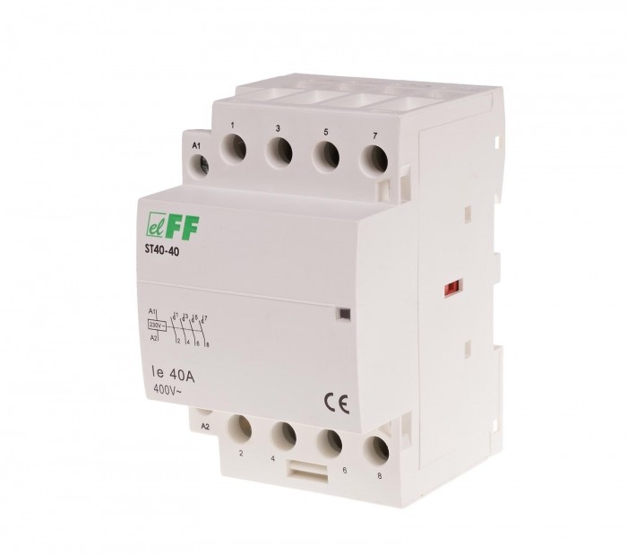 Stycznik modułowy. Prąd 40 A. Napięcie 230 V AC. Moc łączeniowa AC1 16 kW. Moc łączeniowa AC3 5,5 kW. Stycznik elektromagnetyczny w obudowie modułowej do bezpośredniego montażu na szynie 35 mm.