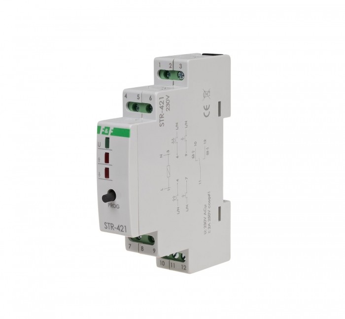 Dwuprzyciskowy. Na szynę 35mm. Sterownik STR przeznaczony jest do sterowania rolet (góra-dół) lub innych obiektów (np. bramy) napędzanych silnikiem elektrycznym jednofazowym prądu zmiennego za pomocą włączników chwilowych (np. dzwonkowych). Sterownik może pracować jako urządzenie samodzielne (przeznaczone do otwierania/zamykania jednej rolety), jak również możliwe jest łączenie sterowników w grupy umożliwiające centralne sterowanie wieloma roletami.
