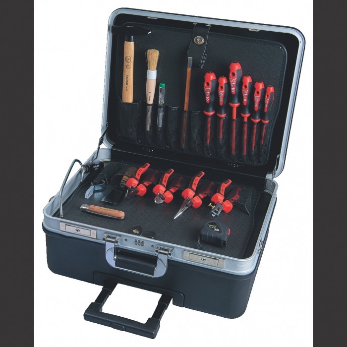 Walizka z twardego tworzywa, czarna, ze stelażem na kółkach,dwa blaty na narzędzia, zamek na kod cyfrowy, z kieszenią na dokumenty, dno walizki z możliwością dowolnego dzielenia różnorodnymi przegrodami, wyposażona w 19 różnych narzędzi. Zawartość: Zawartość: Śrubokręty dla elektryków 2K VDE, 2,5 x 75, 4 x 100, 5,5 x 125, 6,5 x 150 mm Śrubokręt krzyźakowy 2K VDE, PH, rozm. 1 i 2 Szczypce kombinerki 2K VDE, 180 mm* Szczypce telefoniczne 2K VDE, 200 mm, 45° odgięte* Szczypce do izolacji 2K VDE, 160 mm* Obcinak boczny 2K VDE, 165 mm Ściągacz izolacji z ostrzem hakowym O 8 - 28 mm Nóż monterski, 1-częściowy Młotek ślusarski 300 gr. Piłka do metalu kieszonkowa Przecinak dla elektryków 10 x 250 mm Wskaźnik napięcia 120 - 250 V, luźny Taśma miernicza 2 m Szpachelka malarska 40 mm Pędzel * perfekcyjne wykorzystanie siły cięcia