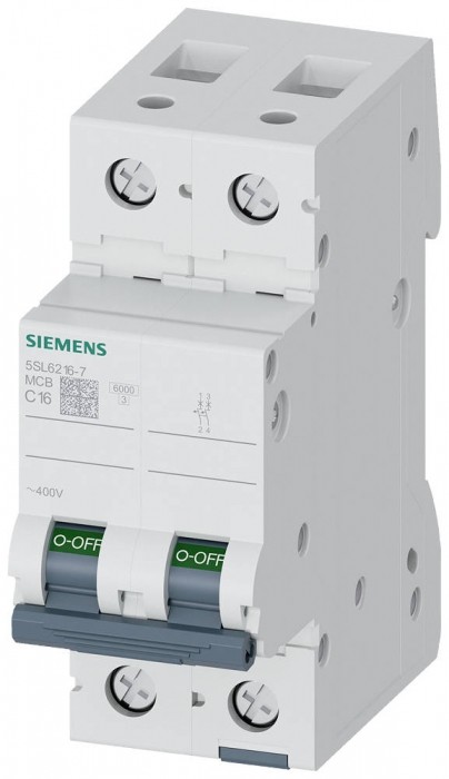 Wyłącznik nadprądowy 400V 6kA, 2-bieg., C, 16A wyłącznik nadmiarowo-prądowy 400 V 6 kA, 2-bieg., C, 16 A Wyłącznik nadmiarowo-prądowy SENTRON do bezpiecznej ochrony przeciwzwarciowej i przeciążeniowej w standardowych zastosowaniach w budynkach mieszkalnych i użytkowych. Montaż i demontaż urządzenia bez użycia narzędzi. Proste okablowanie zasilania przez położoną z tyłu szynę zbiorczą. Wyłączniki nadmiarowo-prądowe 5SL są dostępne w wersjach 1-, 2-, 3-, 4-, a także w wersjach 1+N- i 3+N-biegunowych oraz w innych wykonaniach specjalnych. Szeroka gama akcesoriów, np. łącznik pomocniczy, umożliwia różnorodne rozszerzenie funkcji. Po prostu bezpiecznie z urządzeniami ochronnymi SENTRON.