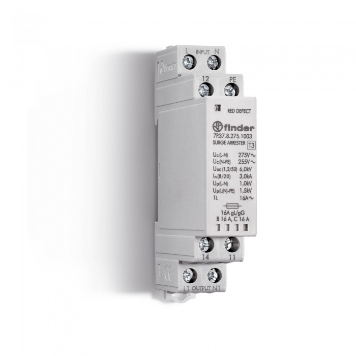 Urządzenie zabezpieczające przed przepięciami Metoda montażu: szyna DIN (szyna top hat) 35 mm Z kontaktem sygnalizacji zdalnej: tak Liczba słupów: 1 Maksymalnie napięcie ciągłe AC: 275 V. Nominalny prąd rozładowania (8/20) (L-N): 3 kA. Napięcie nominalne AC: 230 V. Kategoria 3: tak. Poziom ochrony napięciowej L-N: 1 kV. Sygnalizacja w urządzeniu: Kategoria ochrony optycznej: IP20 Z filtrem tłumiącym zakłócenia: nie