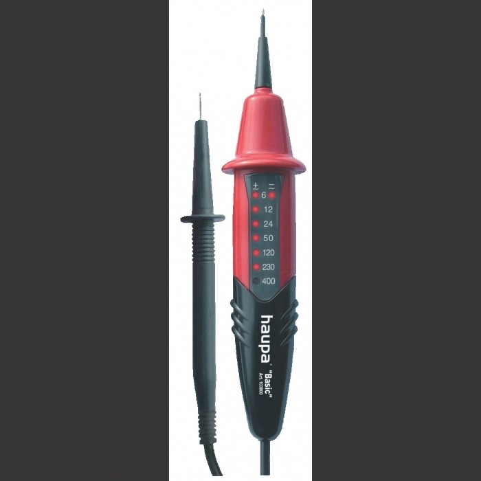 Dwubiegunowy wskaźnik napięcia Basic + Dwubiegunowy wskaźnik napięcia niezawodnie wskazuje napięcia prądu stałego i zmiennego w zakresie od 6 do 400 V w 7 krokach za pomocą wskaźnika LED-owego (6, 12, 24, 50, 120, 230 i 400). Ponadto elektronika umożliwia określenie biegunów i fazy w stosunku do przewodu ochronnego. „Basic +“ przekonuje przyjazną dla użytkownika konstrukcją i wytrzymałą obudową, która gwarantuje jego długą żywotność. Gumowana powierzchnia zapewnia pewny chwyt w dłoni. Przyrząd ten działa bez baterii. Czerpie napięcie z testowanego obiektu. Funkcje i zalety przyjazny dla użytkownika i wytrzymały zakres napięcia do 400 V AC/DC szukanie fazy w stosunku do przewodu ochronnego Dane techniczne „Basic +“ Wskaźnik: optyczny, 8 LEDs Kategoria przepięcia: CAT III 400 V Wymiary: 210 x 60 x 30 mm Ciężar: 100 g Kolor: czerwony/czarny Akcesoria (opcjonalnie): torba Zakres napięcia: 6 - 400 V AC/DC Zasilanie: z testowanego obiektu Biegunowość: tak (+,- LED) Norma: EN 61243-3:2010 Obudowa: wysokiej jakości tworzywo sztuczne z gumowanym uchwytem Gwarancja: 2 lat
