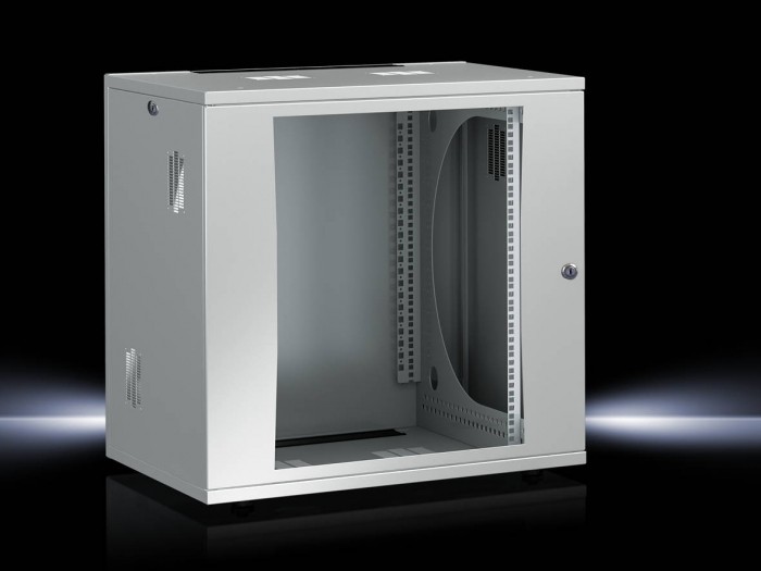 Obudowa IT-ścienna/stojąca 15 U w formie płaskiej do montażu bez narzędzi do montażu bez narzędzi 15 U z regulowaną głębokością ramy montażowej 482,6 mm (19") z przodu w układzie skoku 25 mm, składającą się z części ściennej, dwóch prętów nośnych, dachu i płyty dławkowej, każda z wycięciem na kabel zasilający, pokrytych paskami szczotkowymi, dwoma blokowalnymi panelami bocznymi oraz zamykanymi drzwiami przeszklonymi. Obudowa jest zbudowana z elementów łączących zatrzaski, bez narzędzi. Symetryczna konstrukcja podstawowa umożliwia budowę bez zamieszania . Łatwo wybierany otrzask do drzwi. Statyczna nośność poziomu 482,6 mm (19") wynosi 5 kg/U. Szerokość obudowy 700 mm pozostawia miejsce na dużą liczbę kabli z boku. Panele boczne, dach i rama podstawowa każda z dwoma polami wentylacyjnymi do wentylacji pasywnej, możliwe jest rozszerzenie klimatyzacji aktywnej za pomocą silników wentylatorów, które można uzyskać osobno, pola wentylacyjne, które nie są wymagane, można zamknąć za pomocą płyt pokrywowych, które można uzyskać osobno. Zastosowanie w formie stojącej obudowy jest możliwe przy dowolnych stopach poziomowania. Dodatkowy tylny poziom montażu 482,6 mm (19") możliwy jest dzięki poziomym zestawom szyn dostępnych osobno. Materiał: Blacha stalowa, drzwi przeszklone z szybą z pojedynczym szybowym wykończeniem powierzchni: Powłoka proszkowa w RAL 7035 Wymiary (Szerokość x Wysokość x Rozstrzygnięcie): 700 x 758 x 700 mm, 15 U