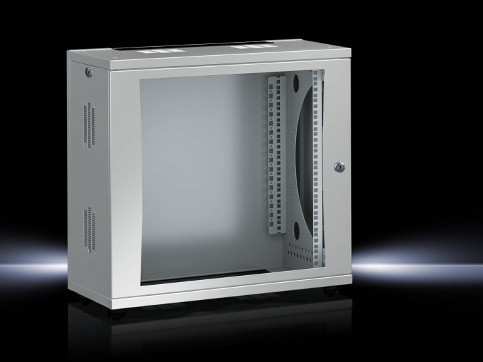 12-U obudowa IT-ścienna/stojąca w formie płaskiego do montażu bez narzędzi 12 U obudowa ścienna/stojąca z regulowaną głębokością 482,6 mm (19") ramy montażowej z przodu w układzie 25 mm, składająca się z części ściennej, dwóch prętów nośnych, dachu i płyty przyprawowej, każda z wycięciem do przewodu zasilającego, pokryta szczotkowymi paskami, dwoma kątami montażowymi 482,6 mm (19"), dwa zamykane boczne panele oraz zamykane przeszklone drzwi. Obudowa jest zbudowana z elementów łączących zatrzaski, bez narzędzi. Symetryczna konstrukcja podstawowa umożliwia budowę bez zamieszania. Łatwo wybierany otrzask do drzwi. Statyczna nośność poziomu 482,6 mm (19.): 5 kg/U. Panele boczne, dach i rama podstawowa każdy z dwoma polami wentylacyjnymi do pasywnej wentylacji, możliwe jest rozszerzenie do klimatyzacji aktywnej za pomocą silników wentylatorów, które można uzyskać osobno, pola wentylacyjne, które nie są wymagane, zamykać za pomocą pokryw, które można uzyskać osobno. Zastosowanie w formie stojącej obudowy jest możliwe przy dowolnych stopach poziomowania. Dodatkowy tylny poziom montażu 482,6 mm (19") możliwy jest dzięki poziomym zestawom szyn dostępnych osobno. Materiał: Blacha stalowa, drzwi przeszklone z szybą z pojedynczym szybowym wykończeniem powierzchni: Powłoka proszkowa w RAL 7035 Wymiary (Szerokość x Wysokość x Cz): 600 x 625 x 400 mm, 12 U