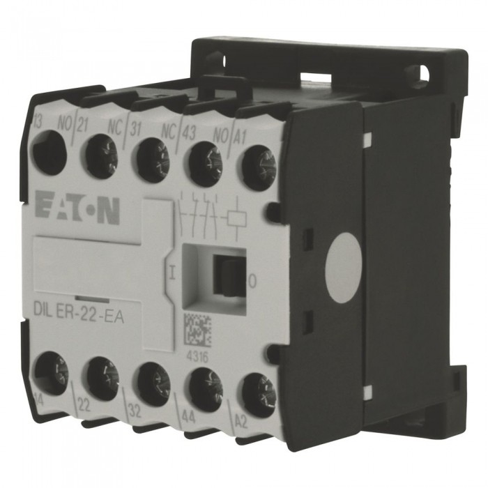 Stycznik pomocniczy, Zacisk śrubowy: Miniaturowe styczniki DILER, Zastosowanie: Styczniki pomocnicze, Opis: z przeciwstawnymi sprzężonymi stykami, Sposób podłączenia: Zaciski śrubowe, Znamionowy prąd roboczy Prąd cieplny umowny na wolnym powietrzu, 1 biegun Otwarcie przy 50°C: Ith =Ie= 10 A, Znamionowy prąd roboczy AC-15, 220 V 230 V 240 V: Ie= 6 A, 380 V 400 V 415 V: Ie= 3 A, Zestyki Z = zwierne: 2 Z, Styki R = rozwierne: 2 R, Numer kodu oraz wersja kombinacji Specyficzny numer: 22E, Do zastosowania z: …DILE, Napięcie sterujące: 230 V 50 Hz, 240 V 60 Hz, Napięcie AC/DC: Praca AC, Stopień ochrony: IP20