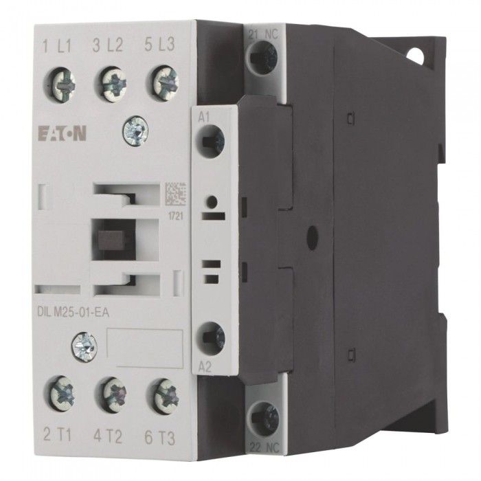 Stycznik, Zastosowanie: Styczniki do silników, Styczniki do 170 A, 3-biegunowy, Kategoria użytkowa: AC-1: Obciążenia nieindukcyjne lub obciążenia o małej indukcyjności, piece oporowe, NAC-3: Standard. silniki indukcyjne AC: rozruch, wyłączanie w trakcie pracy, AC-4: Stand.silniki induk.AC:rozruch,podłącz.,cofanie,pr. spowol.,Sposób podłącz.: Zaciski śrubowe, Uwagi: Odpowiednie również dla silników o klasie sprawności IE3., Urządzenia spełniające normy IE3 są oznaczone odpowiednim logo na opakowaniu., Liczba biegunów: 3-biegunowy, Znamionowy prąd roboczy AC-3, 380 V 400 V: Ie= 25 A, Znamionowy prąd roboczy AC-1 Prąd cieplny umowny na wolnym powietrzu, 3-biegunowy