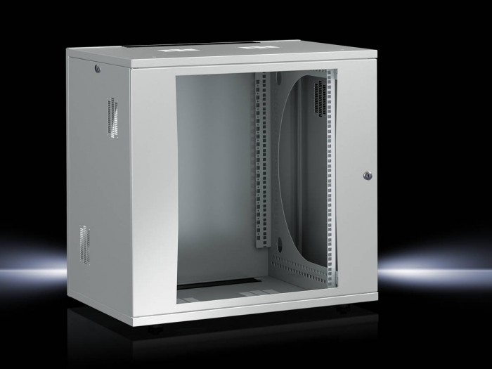 12-U obudowa IT-ścianowa/stojąca w formie płaskiego do montażu bez narzędzi 12 U ściana/stojąca z regulowaną głębokością ramy montażowej 482,6 mm (19") z przodu w układzie skoku 25 mm, składająca się z części ściennej, dwóch prętów nośnych, dachu i płyty przepustowej, każda z wycięciem do przewodu zasilającego, pokrytych paskami szczotkowymi, dwóch kątów montażowych 482,6 mm (19"), dwa zamykane boczne panele oraz zamykane przeszklone drzwi. Obudowa jest zbudowana z elementów łączących zatrzaski, bez narzędzi. Symetryczna konstrukcja podstawowa umożliwia budowę bez zamieszania . Łatwo wybierany otrzask do drzwi. Statyczna nośność poziomu 482,6 mm (19") wynosi 5 kg/U. Panele boczne, dach i rama podstawowa każdy z dwoma polami wentylacyjnymi do wentylacji pasywnej, możliwe jest rozszerzenie klimatyzacji czynnej za pomocą silników wentylatorów , które można uzyskać osobno, pola wentylacyjne, które nie są wymagane, zamykać za pomocą płyt pokrywowych, które można uzyskać osobno. Zastosowanie w formie stojącej obudowy jest możliwe przy dowolnych stopach poziomowania. Dodatkowy tylny poziom montażu 482,6 mm (19") możliwy jest dzięki zestawom szyn poziomych, które można kupić osobno. Materiał: Blacha stalowa, drzwi przeszklone z szybą z pojedynczym szybowym wykończeniem powierzchni: Powłoka proszkowa w RAL 7035 Wymiary (Szerokość x Wysokość x Rozstrzygnięcie): 600 x 625 x 600 mm, 12 U