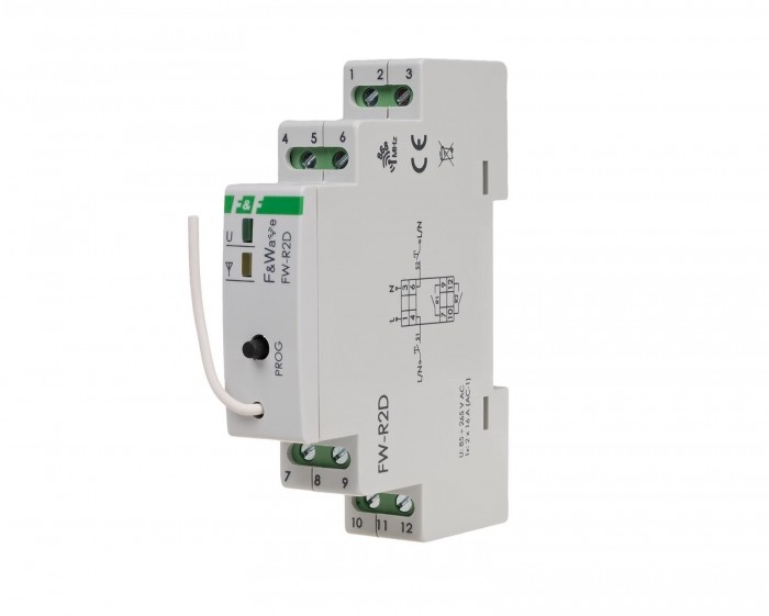 Podwójny przekaźnik bistabilny Na szynę 35 mm; Współpraca z nadajnikami zdalnego sterowania F&Wave; Możliwość sterowania z maksymalnie 8 nadajników; Dwa wejścia sterowania lokalnego - możliwość bezpośredniego sterowania przekaźnikami z użyciem dowolnych przycisków monostabilnych (np. dzwonkowych); Dwa niezależne separowane styki wyjściowe NO o obciążalności 16 A (AC-1); Kompaktowa obudowa - jedno pole w rozdzielni; Retransmisja rozkazów z nadajnika - możliwość zwiększenia zasięgu zdalnego sterowania; Niewielki pobór mocy - niski koszt eksploatacji; Wbudowane, elektroniczne zabezpieczenie termiczne, zapobiegające uszkodzeniu w przypadku nadmiernego obciążenia przekaźnika.