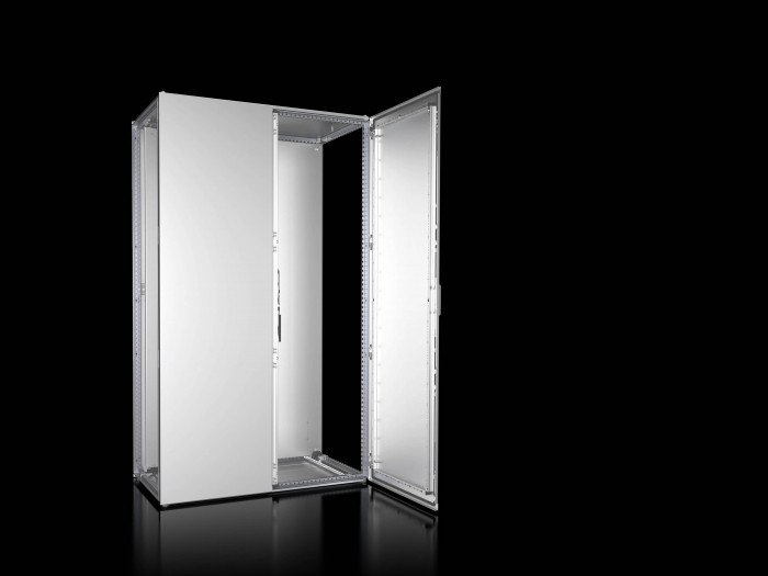 Obudowa (system rozstawkowy) podwójnych drzwi Obudowa: symetryczna konstrukcja ramowa, składająca się z zamkniętej profilowanej pustej sekcji o rozstawie 25 mm. Rama z zintegrowaną nakrętką nitową M6 umożliwia mocowanie elementów dopasowanych w profilu zorientowanym na klasę ochrony . Wszystkie sekcje mają fazowane krawędzie. Poziome sekcje mają ochronną krawędź nad uszczelką. Obwodowe profile równe z dwoma poziomami montażowymi dostępnymi od środka i z zewnątrz ramy, co pozwala oszczędzać miejsce i szybko montować wnętrze. Cała kwadratowa perforacja umożliwia zastosowanie nakrętek klatkowych i śrub metrycznych do M8. Spawana rama podstawowa z zintegrowanym wzmocnieniem pozwala mocować obudowę na podziemiu przez wewnętrzną stronę obudzenia. Zamontowana, trzyczęściowa płytka dławkowa, zdejmowana i wymienna. Można je przepuścić ze wszystkich stron. Ładowność do 15 000 N. Drzwi: z uszczelnieniem piankowym, z zdejmowaną rurową ramą drzwi z otworami o rozstawie 25 mm oraz zintegrowanym zaciskiem kabli. Drzwi zamykane po stronie prawej/h z czteropunktowym drążkiem blokującym, wkładka dwuwiercidlowa zgodnie z normą DIN 43668. Sąsiednie drzwi dodatkowo zamykane u góry i na dole dźwignią obrotową. Zawiasy z zaciętymi sworzniami, kąt otwarcia drzwi 130° , bez narzędzia do przeróbki do 180°. Prześwit 17 mm. Tylna płyta i płyta dachowa: z uszczelnieniem z pianką, zdejmowalne. Tylna płyta i płyta dachowa są przykręcane i zdejmowane. Tylny panel z pomocą pozycyjną. Dach z śrubami mocującymi dach M12. Płyta montażowa: składana w kształcie C po bokach, regulowana na głębokość za pomocą wbudowanych plastikowych przesuwów oraz z wielokrotnie używanymi szynami montażowymi, regulowana na głębokość w układzie skoku 25 mm. W tym wzór montażowy ułatwiający ustawianie komponentów. Płaskie części: Dach, drzwi i tylna płyta wliczone do zakresu zaopatrzenia. Panele boczne dostępne są jako osobny dodatek. Tylny panel, dach i płyty dławkowe są przewodzące elektrycznie połączone z ramą (automatyczne wyrównanie potencjałów) zgodnie z normą DIN 62 208 i przygotowane do dodatkowego mocowania pasków uziemiających. Kod QR: Wydrukowany kod QR na dachu, drzwiach, tablicy montażowej, panelu tylnym i tabliczce typowej dla jednoznacznego oznaczania oraz łatwego przywołania istotnych informacji i dokumentacji produktów oraz wyraźnej wykrywalności pojedynczych części. Materiał: Rama obudowy, tylna płyta, dach i płyty dławowe: 1,5 mm Stal nierdzewna 1.4301 (AISI 304) Drzwi: 2 mm stal nierdzewna 1.4301 (AISI 304) Płyta montażowa: 3 mm blacha stalowa Wykończenie powierzchni: Rama obudowy i płytki wchłazowe: niepowlekane Drzwi(y), dach i tylny panel: zewnętrznie szczotkowane, o rozmiarze usłoj 400 Montaż: blacha montażu: cynkowana kategoria ochrony według IEC 60 529 (z zamontowanymi panelami bocznymi): Kategoria ochrony IP 55 do UL 508A: Typ 1, 12 Ochrona przed uderzeniami zgodnie z IEC 62 262: Wymiary IK10 (Szerokość x Wysokość x Wysokość): 1200x2000x600 mm
