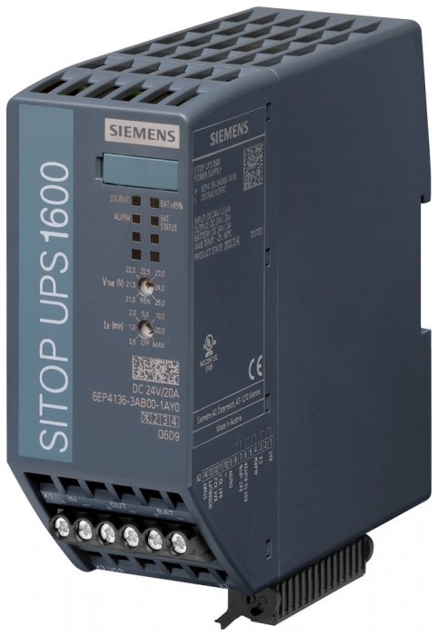 Zasilacz bezprzerwowy SITOP UPS1600, DC 24 V/20 A z USB SITOP UPS1600 20 A USB bezprzerwowe zasilanie elektryczne z interfejsem USB wejście: 24 V DC wyjście: 24 V DC/20 A Zasilacz bezprzerwowy SITOP UPS1600 z modułami bateryjnymi UPS1100 jest optymalnym uzupełnieniem wszystkich zasilaczy 24 V. Buforuje dłuższe awarie sieci zasilającej przez czas sięgający godzin, a tym samym zapewnia nieprzerwaną pracę instalacji. Inteligentny system zarządzania baterią automatycznie rozpoznaje system magazynowania energii UPS1100, zapewnia optymalne ładowanie z kontrolą temperatury i ciągłe monitorowanie. Kompaktowe moduły UPS1600 są odporne na przeciążenia, dzięki czemu mogą np. dostarczać prąd rozruchowy do komputerów przemysłowych. Komunikaty o stanie są wysyłane za pośrednictwem styków sygnalizacyjnych. Komunikacja odbywa się ponadto przez otwarty interfejs USB. Zasilacz UPS DC można łatwo monitorować i konfigurować za pomocą aplikacji SITOP UPS Manager.