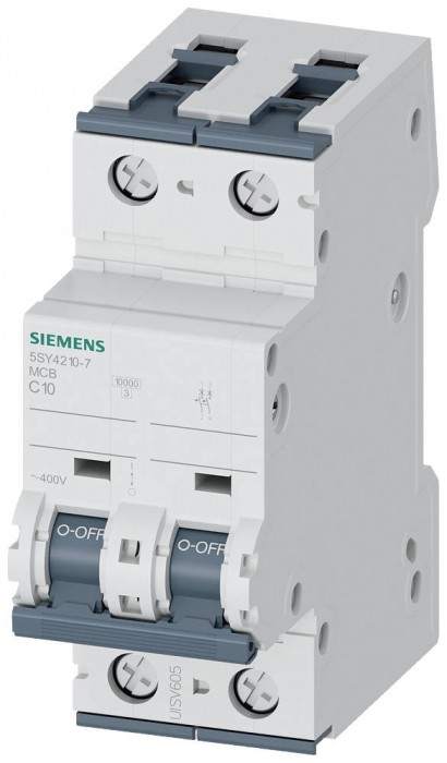 Wyłącznik nadprądowy 400V 10kA, 2-bieg., C, 10A, głęb.=70mm wyłącznik nadmiarowo-prądowy 400 V 10 kA, 2-bieg., C, 10 A, głęb.=70 mm Wyłącznik nadmiarowo-prądowy SENTRON do bezpiecznej ochrony przeciwzwarciowej i przeciążeniowej w budynkach mieszkalnych, użytkowych i specjalnych zastosowaniach przemysłowych. Montaż i demontaż urządzenia bez użycia narzędzi, za pomocą podwójnego suwaka. Dowolna kombinacja przewodów i szyny zbiorczej dzięki dwukomorowemu zaciskowi. Proste okablowanie zasilania przez położoną z tyłu szynę zbiorczą. Wyłączniki nadmiarowo-prądowe 5SY są dostępne w wersjach 1-, 2-, 3-, 4-, a także w wersjach 1+N- i 3+N-biegunowych. Kompleksowe akcesoria są takie same dla wszystkich wyłączników nadmiarowo-prądowych 5SY. Po prostu bezpiecznie z urządzeniami ochronnymi SENTRON.