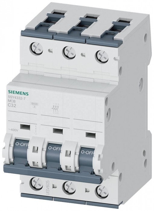 Wyłącznik nadprądowy 400V 10kA, 3-bieg., C, 32A, głęb.=70mm wyłącznik nadmiarowo-prądowy 400 V 10 kA, 3-bieg., C, 32 A, głęb.=70 mm Wyłącznik nadmiarowo-prądowy SENTRON do bezpiecznej ochrony przeciwzwarciowej i przeciążeniowej w budynkach mieszkalnych, użytkowych i specjalnych zastosowaniach przemysłowych. Montaż i demontaż urządzenia bez użycia narzędzi, za pomocą podwójnego suwaka. Dowolna kombinacja przewodów i szyny zbiorczej dzięki dwukomorowemu zaciskowi. Proste okablowanie zasilania przez położoną z tyłu szynę zbiorczą. Wyłączniki nadmiarowo-prądowe 5SY są dostępne w wersjach 1-, 2-, 3-, 4-, a także w wersjach 1+N- i 3+N-biegunowych. Kompleksowe akcesoria są takie same dla wszystkich wyłączników nadmiarowo-prądowych 5SY. Po prostu bezpiecznie z urządzeniami ochronnymi SENTRON.