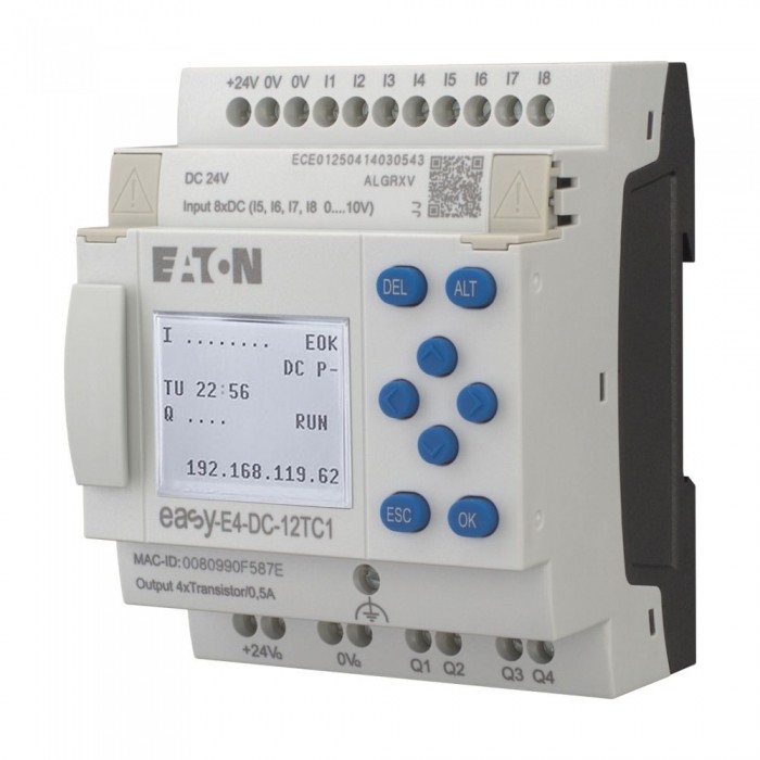 Sterowniki easyE4 z wyświetlaczem (możliwość rozbudowy, Ethernet), 24 V DC, Wejścia cyfrowe: 8, z czego jako analogowych można użyć: 4, zacisk śrubowy Elektroniczny sterownik easy-E4 o napięciu zasilania 24 V DC, 8 wejść cyfrowych o napięciu 24 V DC, można również użyć 4 spośród tych wejść analogowych i 4 wejść jako szybkich liczników. Przekaźnik sterujący easy-E4 posiada 4 wyjścia tranzystorowe dla napięcia 24 V DC. Przekaźnik programowalny jest wyposażony w wyświetlacz, zegar, zintegrowany interfejs Ethernet i zaciski śrubowe. Ten przekaźnik sterujący easy-E4 można rozbudować o cyfrowe rozszerzenia wejścia/wyjścia serii easyE4. Dostawa z programem użytkownika przy użyciu pozycji (Y7) -2010781 EASY-COMBINATION