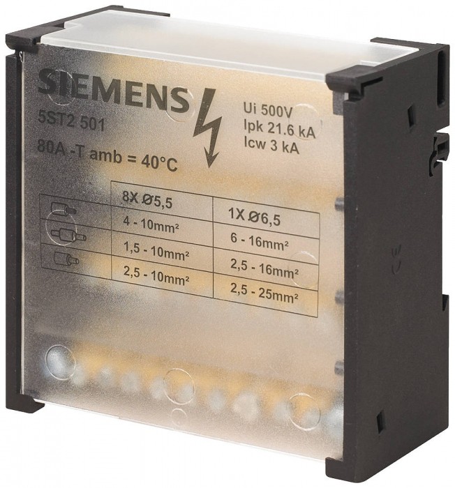 blok rozdzielczy 4-bieg., 80 A, 500 V wejście: 1x 6-16 mm2 wyjście: 8x 4-10 mm2 do montażu na szynie montażowej blok rozdzielczy 4-bieg., 80 A, 690 V, wejście: 1 x 2,5-16 mm2 wyjście: 8 x 1,5-10 mm2 do montażu na szynie montażowej Blok rozdzielczy SENTRON 5ST2 jako komponenty dodatkowe do urządzeń różnicowoprądowych i wyłączników nadmiarowo-prądowych. Te dodatkowe komponenty można uniwersalnie instalować. Są łatwe i wygodne w montażu i łączeniu. Dzięki standardowej ochronie przed dotykiem zapewnione jest bezpieczeństwo podczas instalacji.
