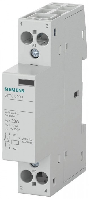 Stycznik instalacyjny z 2 zestykami zwiernymi, zestyk na AC 230 V, 400 V 20 A sterowanie AC 230 V stycznik instalacyjny z 2 zestykami zwiernymi, zestyk do AC 230 V, 400 V 20 A zasterowanie 230 V AC Stycznik instalacyjny SENTRON 5TT5 do zastosowań w budownictwie mieszkaniowym i użytkowym oraz w przemyśle. Aparatura rozdzielcza SENTRON oferuje wygodne i proste wykonywanie montażu i podłączeń oraz niezawodne bezpieczeństwo podczas instalacji dzięki standardowo stosowanej ochronie przed dotykiem. Łączniki zdalnie sterowane, przekaźniki pośredniczące, styczniki instalacyjne i zegary sterujące oferują liczne możliwości realizacji różnych funkcji przełączania. Do aparatury rozdzielczej SENTRON dostępna jestszeroka gama łatwego w montażu wyposażenia dodatkowego. optymalna technika gwarantująca bezpieczeństwo - tylko od firmy Siemens.