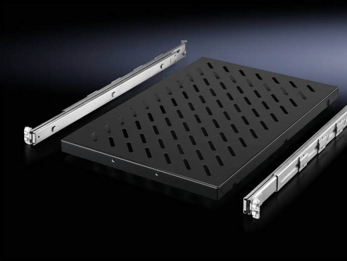 482,6 mm (19") – półka komponentowa, wysuwana półka o szerokości 482,6 mm, z teleskopowym zamkiem, przeznaczona do kątów montażu w kształcie litery L i podobnych kątów montażowych. Do montażu pomiędzy dwoma kątami montażowymi 482,6 mm (19"). Kompletny zestaw, w tym zestaw montażowy o zmiennej głębokości dla poziomów montażu 482,6 mm (19") od 400 do 600 mm. Montaż bez narzędzi, akcesoriów i oszczędzający czas, samodzielny montaż z przodu obudowy. Zlokalizować, wycofać się, szybko ustawić się. Perforowana powierzchnia półki komponentów, aby wspierać klimatyzację wewnątrz obudowy. Półka na komponenty jest samoblokowana, w pełni wysuwana. Głębokość półki komponentu 500 mm, ładowność 100 kg, wysokość półki komponentów 1 1/2 U.