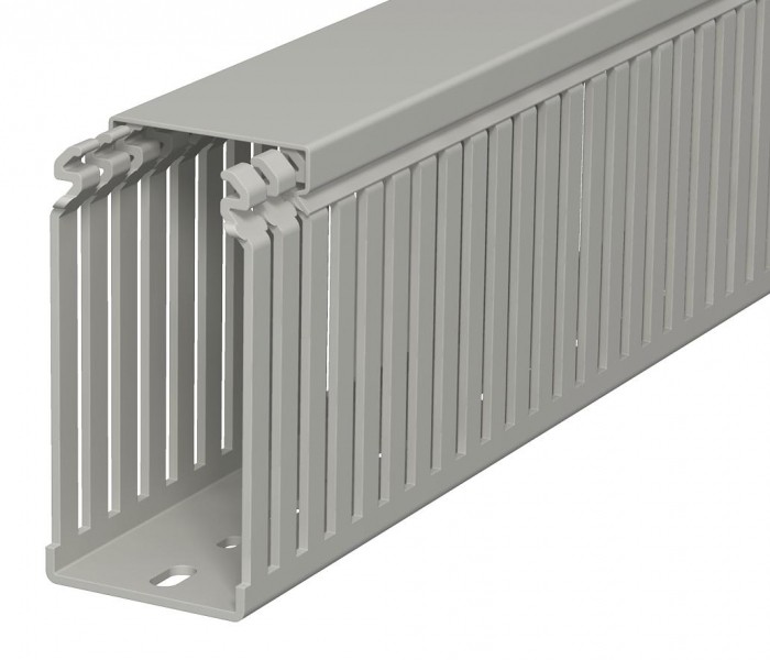 Kanał grzebieniowy 100x50x2000 polichlorek winylu szary kamienny RAL 7030 Kanał grzebieniowy z pokrywą i perforacją podstawy wg normy DIN EN 50085-2-3. Wykonanie specjalne na zapytanie.