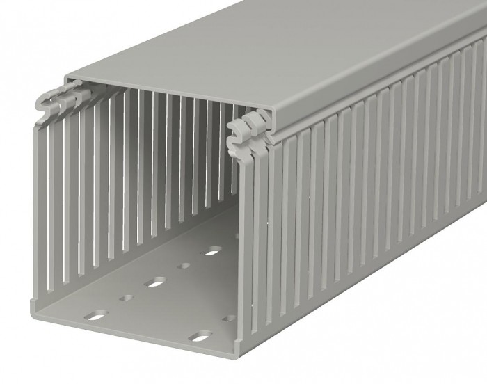 Kanał grzebieniowy 100x100x2000 polichlorek winylu szary kamienny RAL 7030 Kanał grzebieniowy z pokrywą i perforacją podstawy wg normy DIN EN 50085-2-3. Wykonanie specjalne na zapytanie.